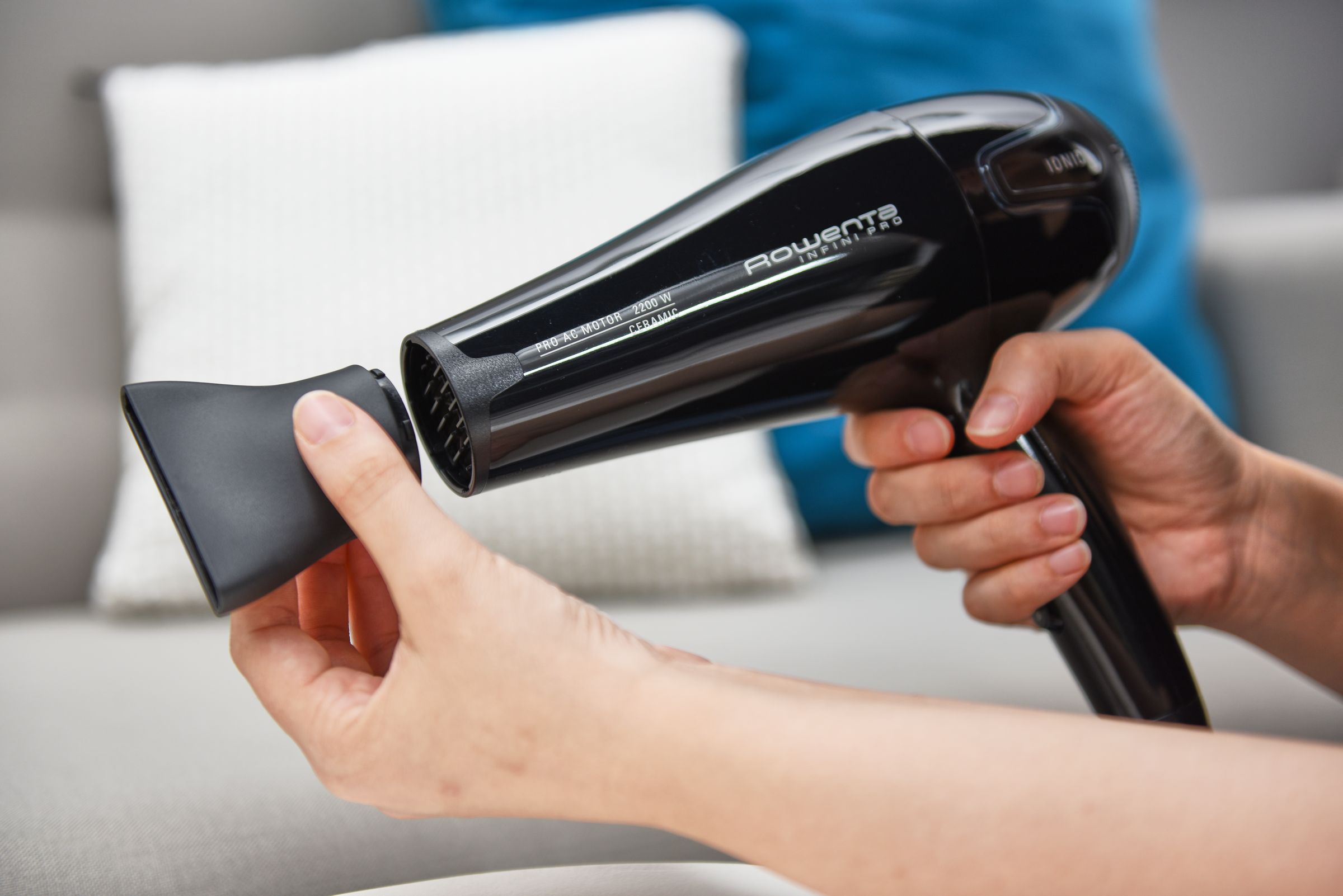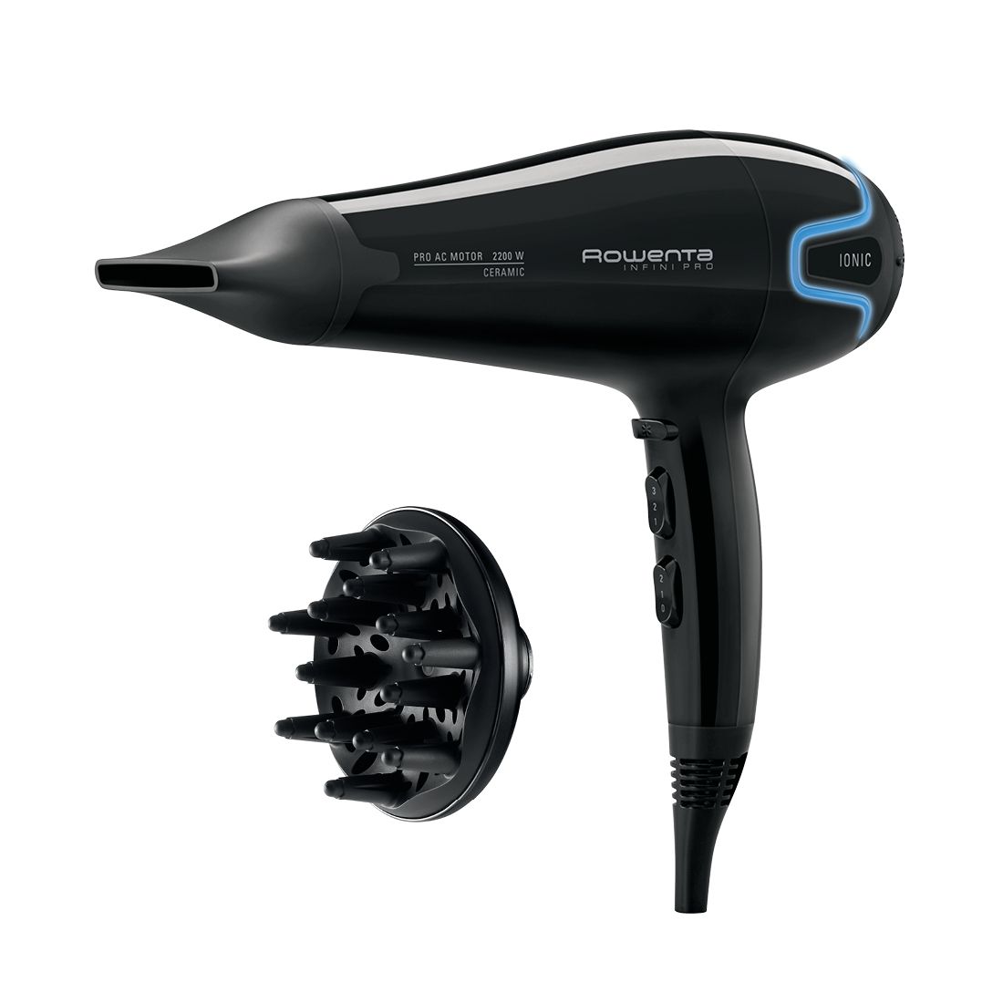 S fénom Rowenta Infini Pre CV8730D0 dosiahnete výsledkov ako od profesionála. Prúdenie vzduchu s rýchlosťou až 120 km/h a úzke koncentrátory zaistí presné a rýchle vysúšanie. S pomocou difuzéra vytvoríte objemný účes, ktorý môžete zafixovať studeným vzduchom. Fén je vybavený funkciou Ionic Control, ktorá slúži na vypnutie a zapnutie ionizačného efektu.